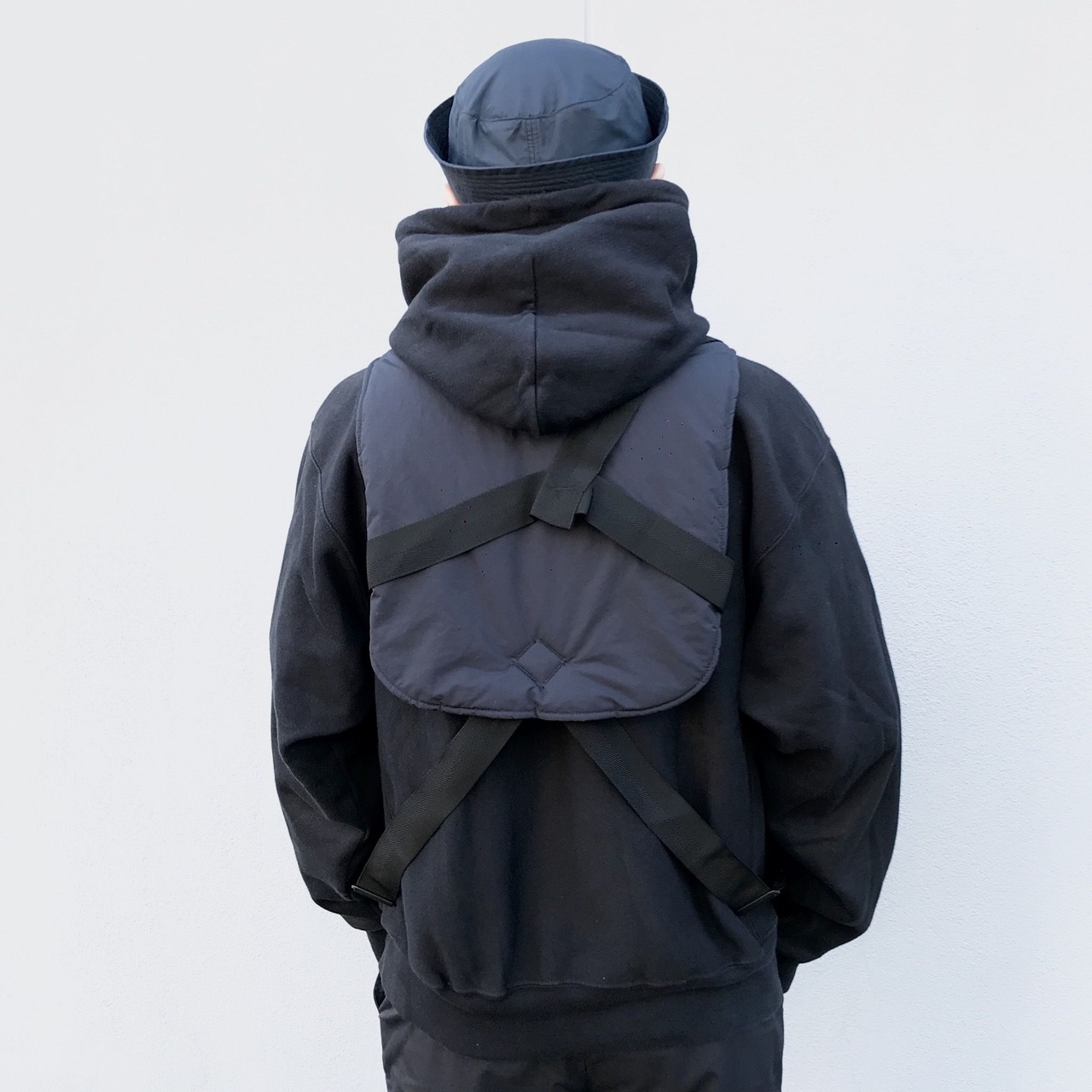 前身頃と後身頃を腰元のベルトで止める為、厚手のアウターやパーカーとのレイヤードも可能で、ブランドのルックでも同素材のダウンハンテンとレイヤードしております。